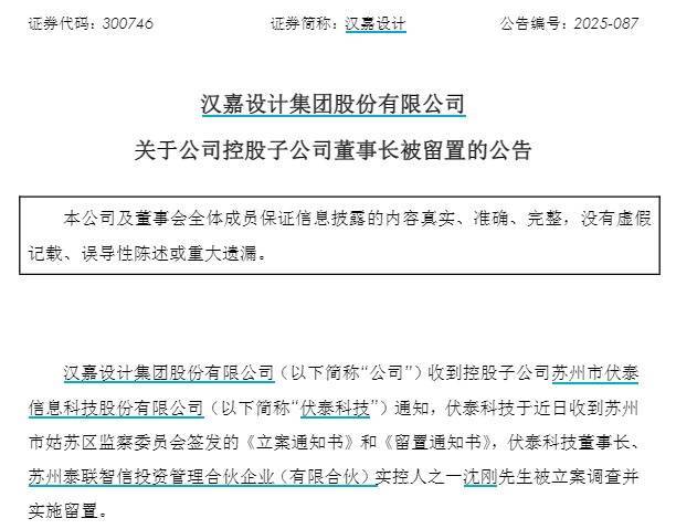 【大河财立方消息】11月17日,汉嘉设计集团股份有限公司(证券简称:汉嘉设计)发布公告称,收到控股子公司苏州市伏泰信息科技股份有限公司(以下简称伏泰科技)通知,伏泰科技于近日收到苏州市姑苏区监察委员会签发的《立案通知书》和《留置通知书》,伏泰科技董事长、苏州泰联智信投资管理合伙企业(有限合伙)实控人之一沈刚被立案调查并实施留置。